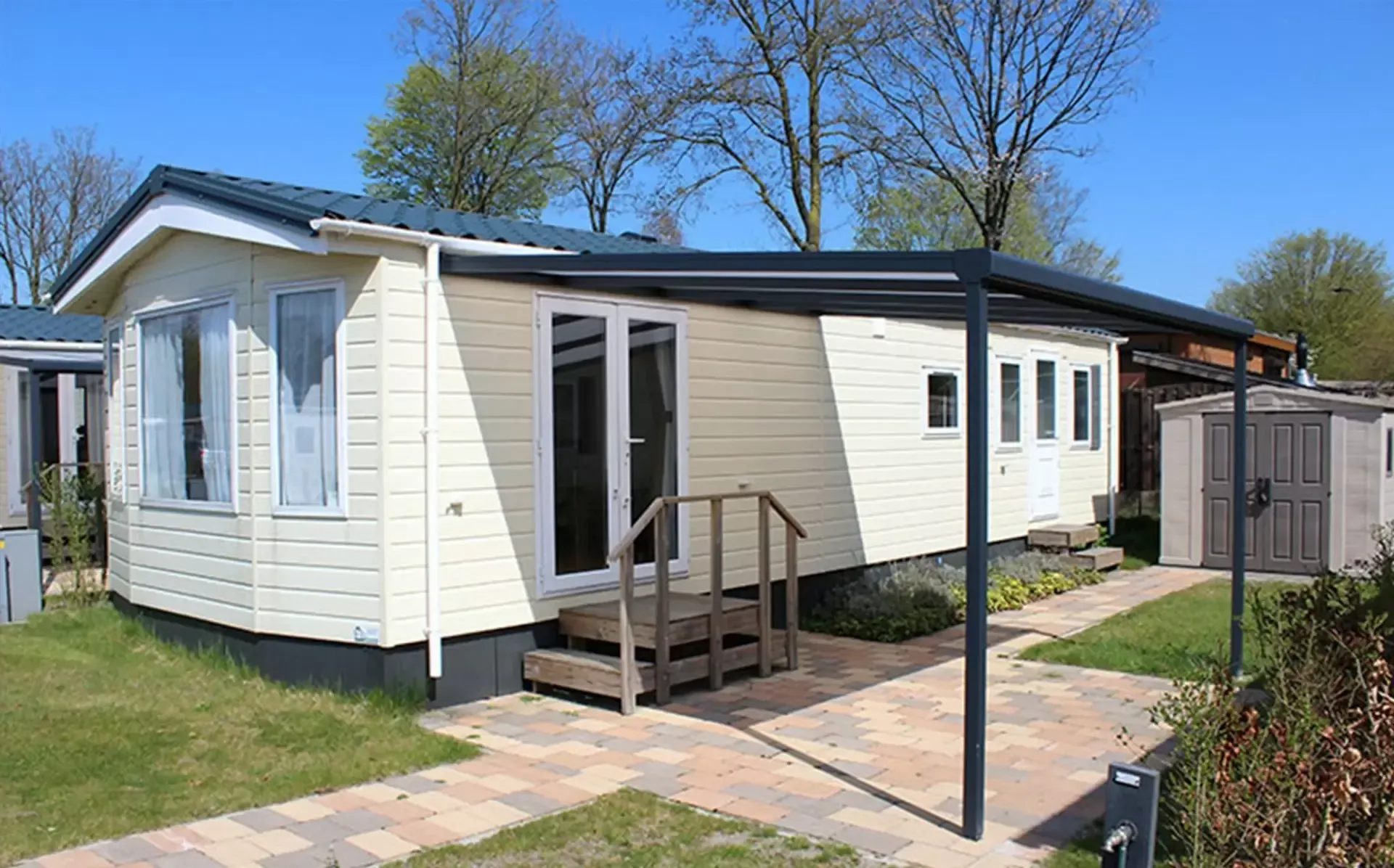 Choose from cream white or grey texturised colours, complemented by polycarbonate roofing, a sustainable material with a classic appearance. Roofing options include clear, ultra clear, opaque, and solar control variants, providing heat resistance.